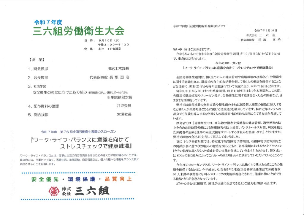 9月10日、本社会議室にて「令和7年度 三六組労働衛生大会」を開催しました。