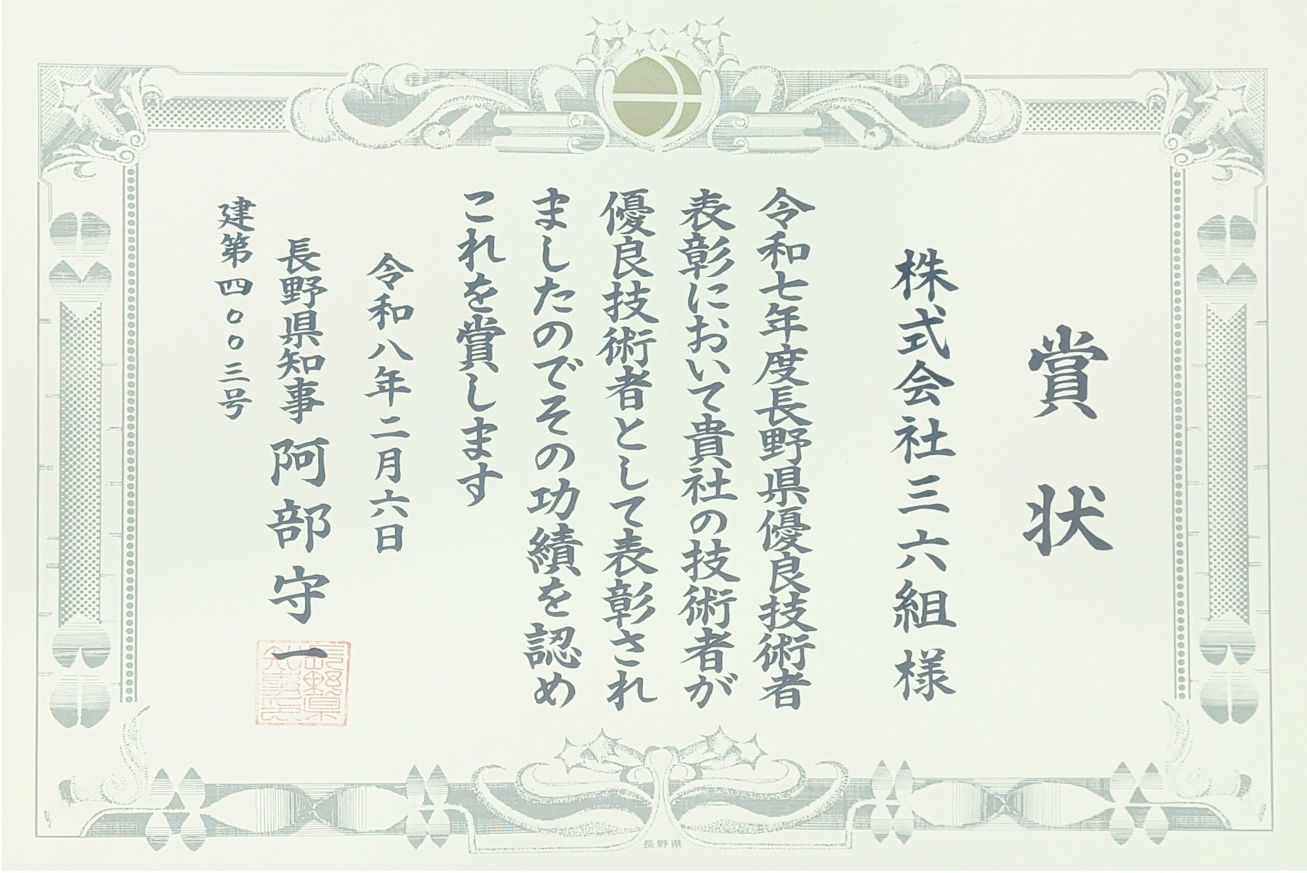 この度、「令和7年度長野県優良技術者表彰」において、当社技術者1名が若手部門で受賞いたしました。